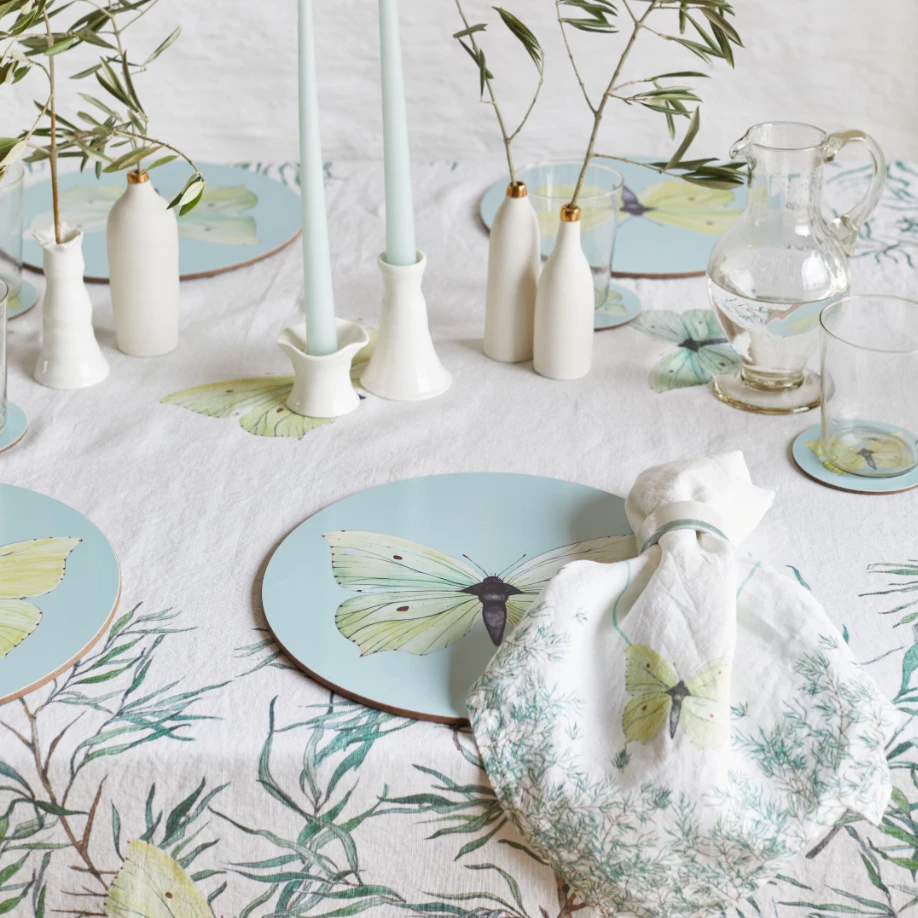 The butterfly that has inspired us with this collection is the spectacular Brimstone, their distinctive leaf- shaped wings a beautiful milky green on the females and a dashing bright yellow on the males. They are interesting as they are the longest lived of all British Butterflies, surviving for up to 12 months. There are a number of plants which this butterfly needs to be successful: buckthorn for breeding, nectar plants such as wild sweet pea and runner bean for feeding, and shrubs such as holly and ivy for hibernation.