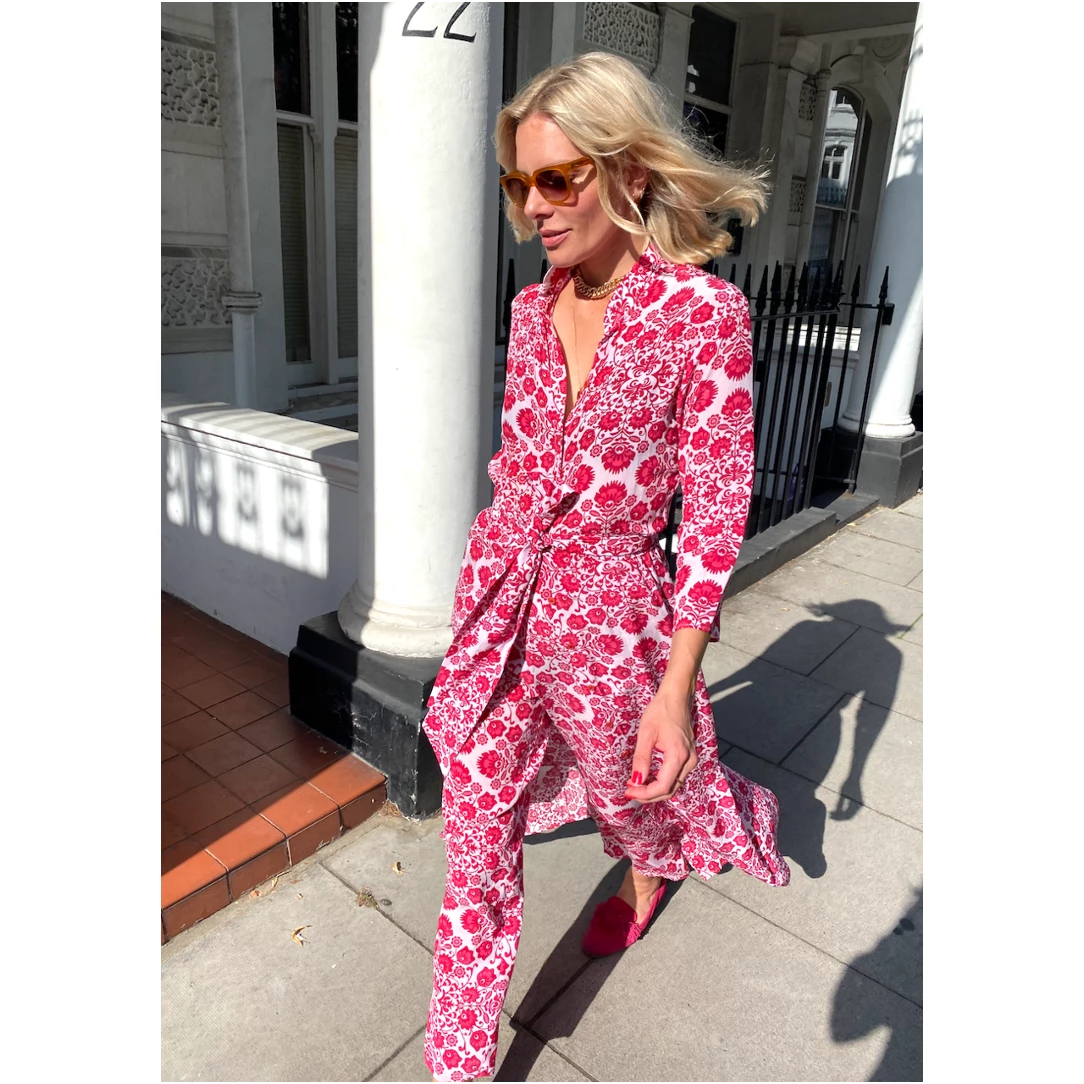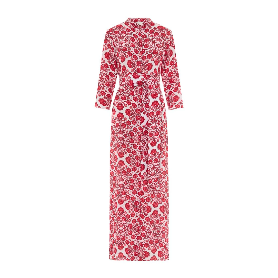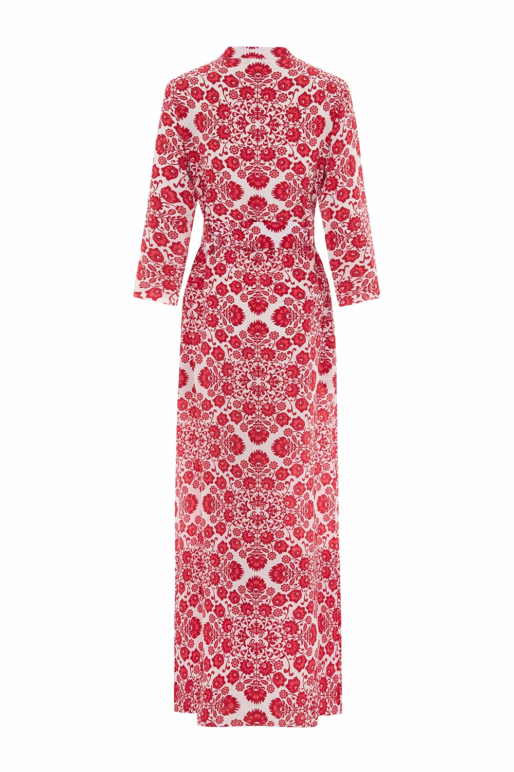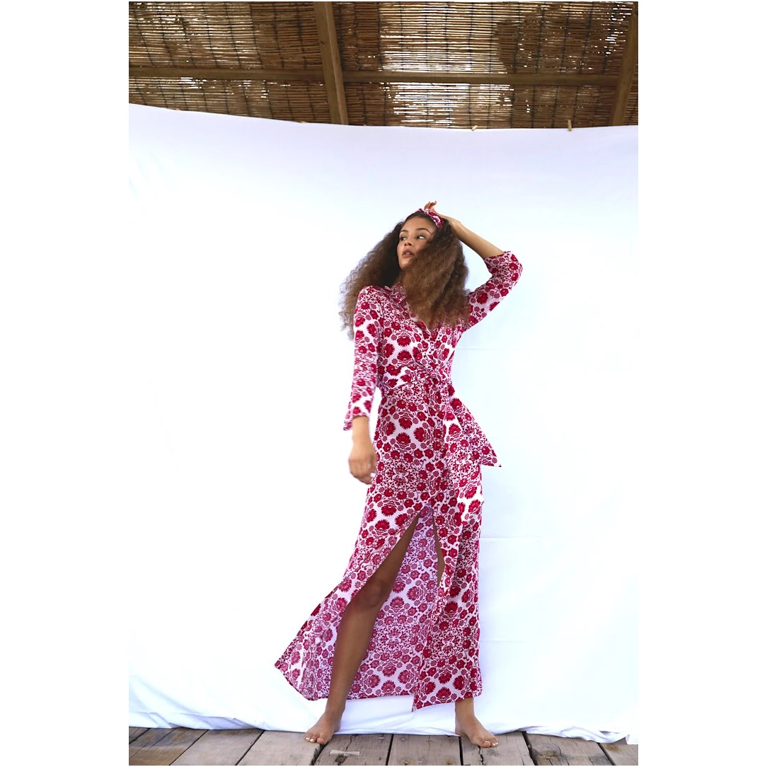 100 % Silk Satin Printed in two options, red or green. Two side pockets; Mother of pearl Button fastenings through front; Matching self-fastening waist tie